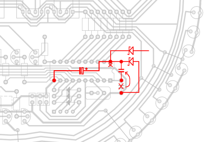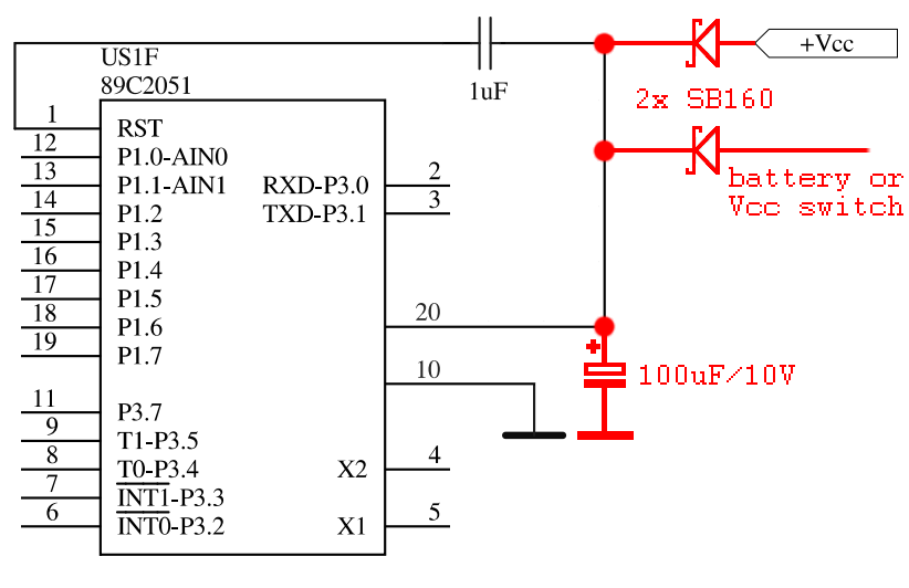 Dále jsem hodiny upravil tak, aby si po odpojení napájení pamatovali čas, toho je docíleno tím že se procesor po odpojení hlavního napájecího napětí napájí z baterie - tedy dál čítá čas - ostatní komponenty nejsou napájeny. Jedná se o drobnou úpravu kdy se přidají dvě schottkyho diody s nízkým prahovým napětím, například SB160.